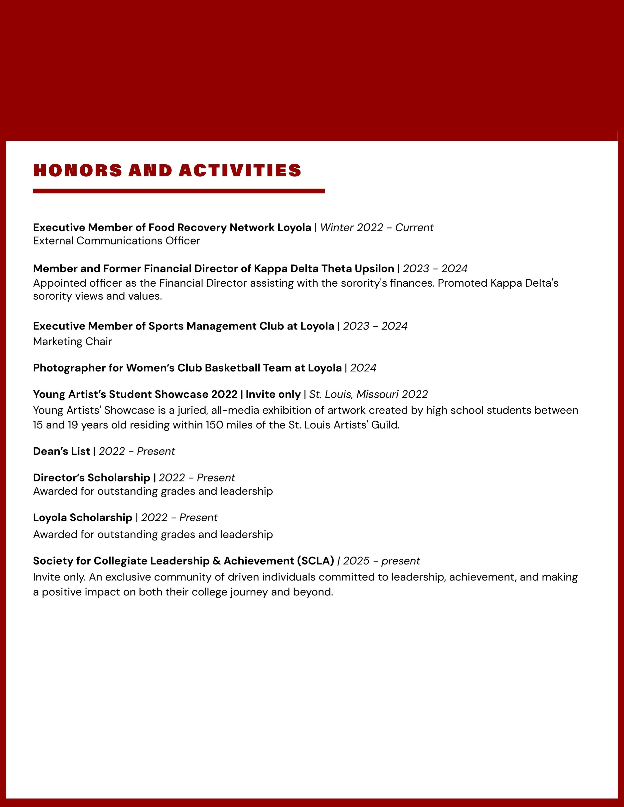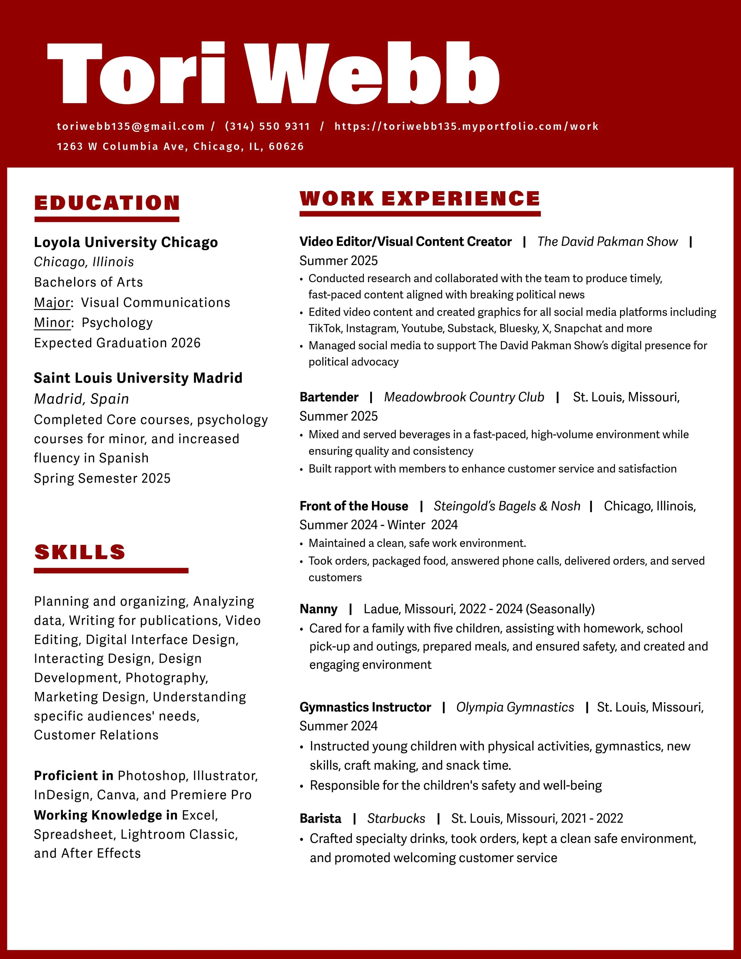 Hello! I am a senior Visual Communications student at Loyola University Chicago with a passion for creating meaningful and emotionally impactful designs. I strive to design work that is both intentional and vulnerable, using design as a tool for storytelling and connection. My experience spans diverse mediums, allowing me to explore innovative approaches to visual communication while maintaining a strong foundation in design principles. I am strongly passionate about using design as a political voice in this world.